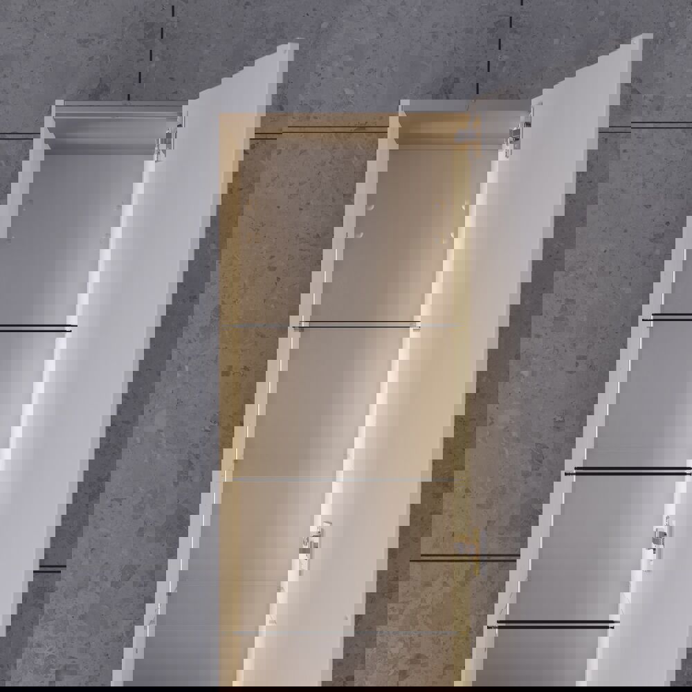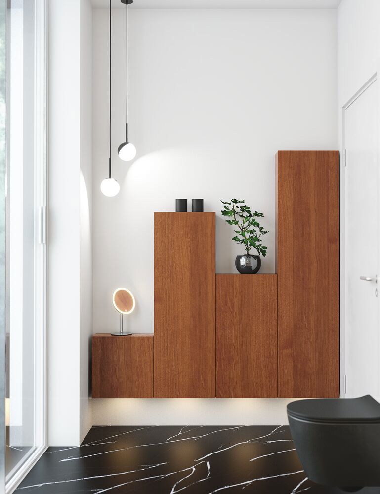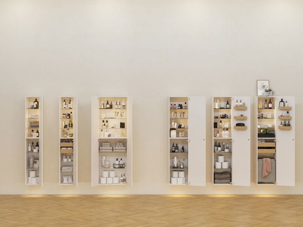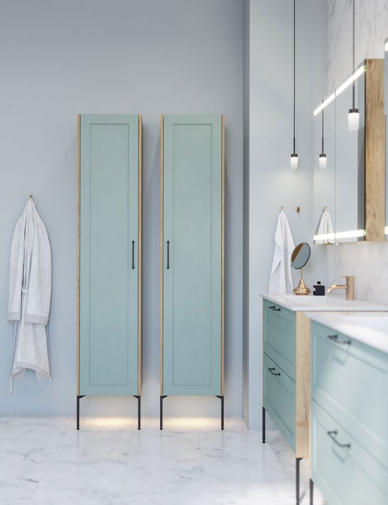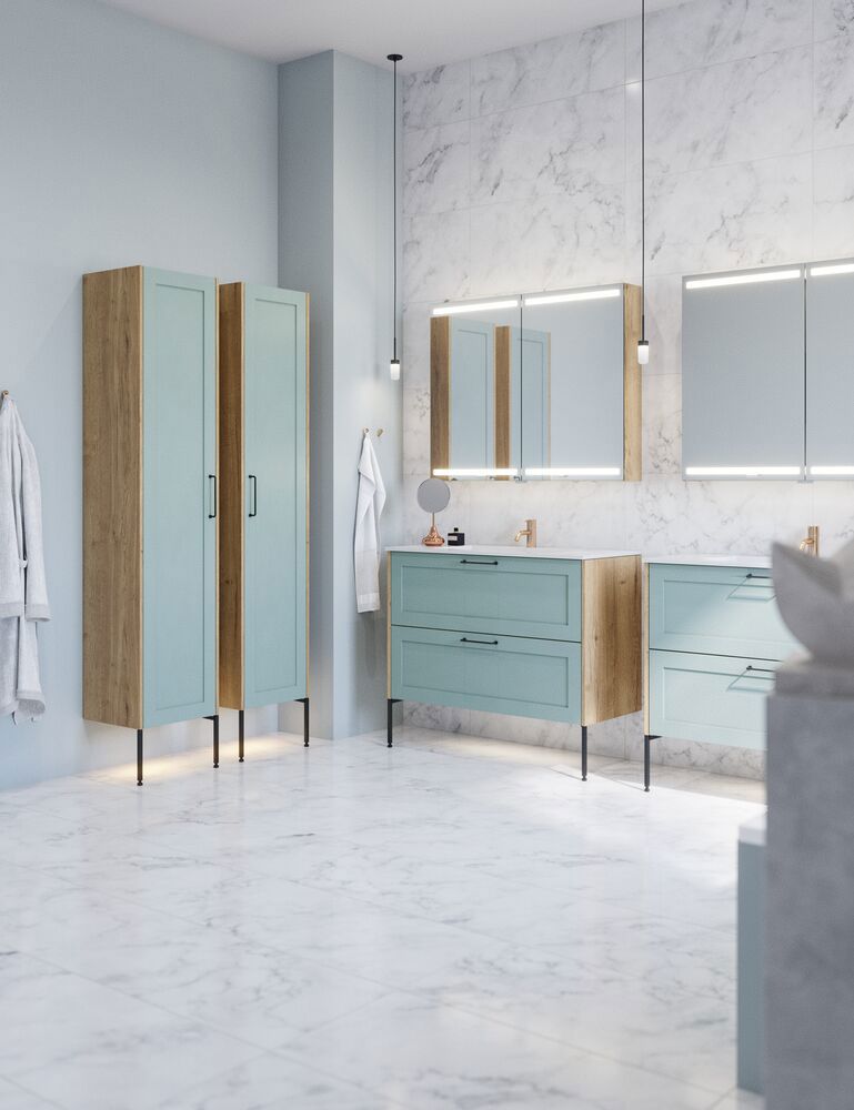 Högskåpet med klassisk ramfront i version B är designat för att ge dig både funktionalitet och stil. Med en trähylla och tre förkortade glashyllor är detta skåp idealiskt för att förvara olika badrumsartiklar. De tre trälådorna på dörren ger extra förvaringsmöjligheter för mindre föremål som kosmetika och mediciner, medan de två glashyllorna är perfekta för att visa upp dina favoritprodukter. Den klassiska stilen på ramfronten tillför ett tidlös.